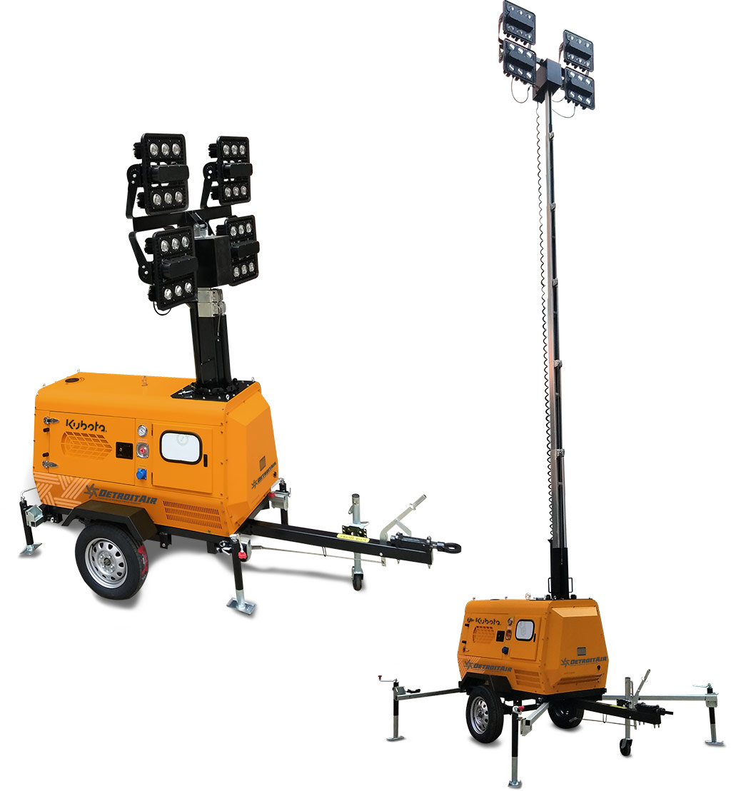 These powerful Detroit Air Mobile Light Towers offer various SAA Certified LED Lamp configurations and solutions. Single-axle, double-axle and skid-mounted solutions are available. Both telescopic and folding mast options are available with up to 10 meters extension possible.